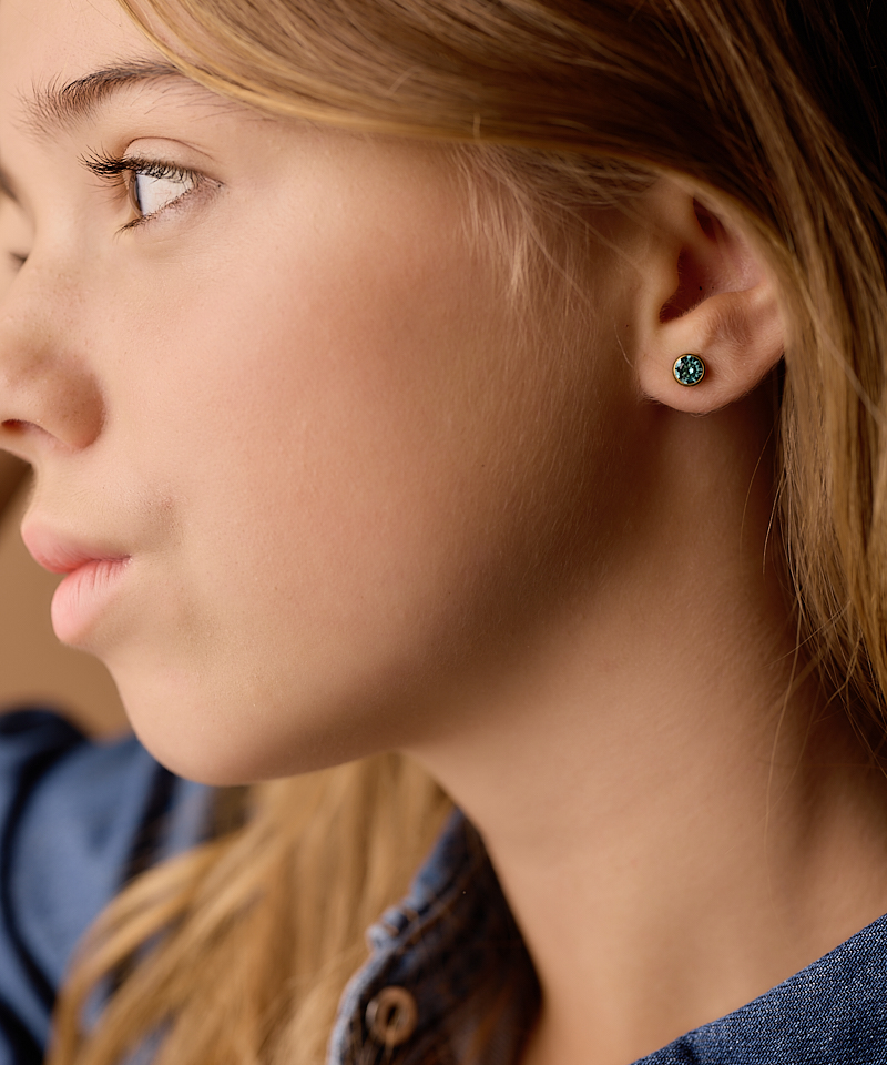 Örhängen utvecklade i samråd med hudläkare, i ren medicinsk titan med kristallstenar. Guldfärgad ytbeläggning som inte kommer i kontakt med huden.